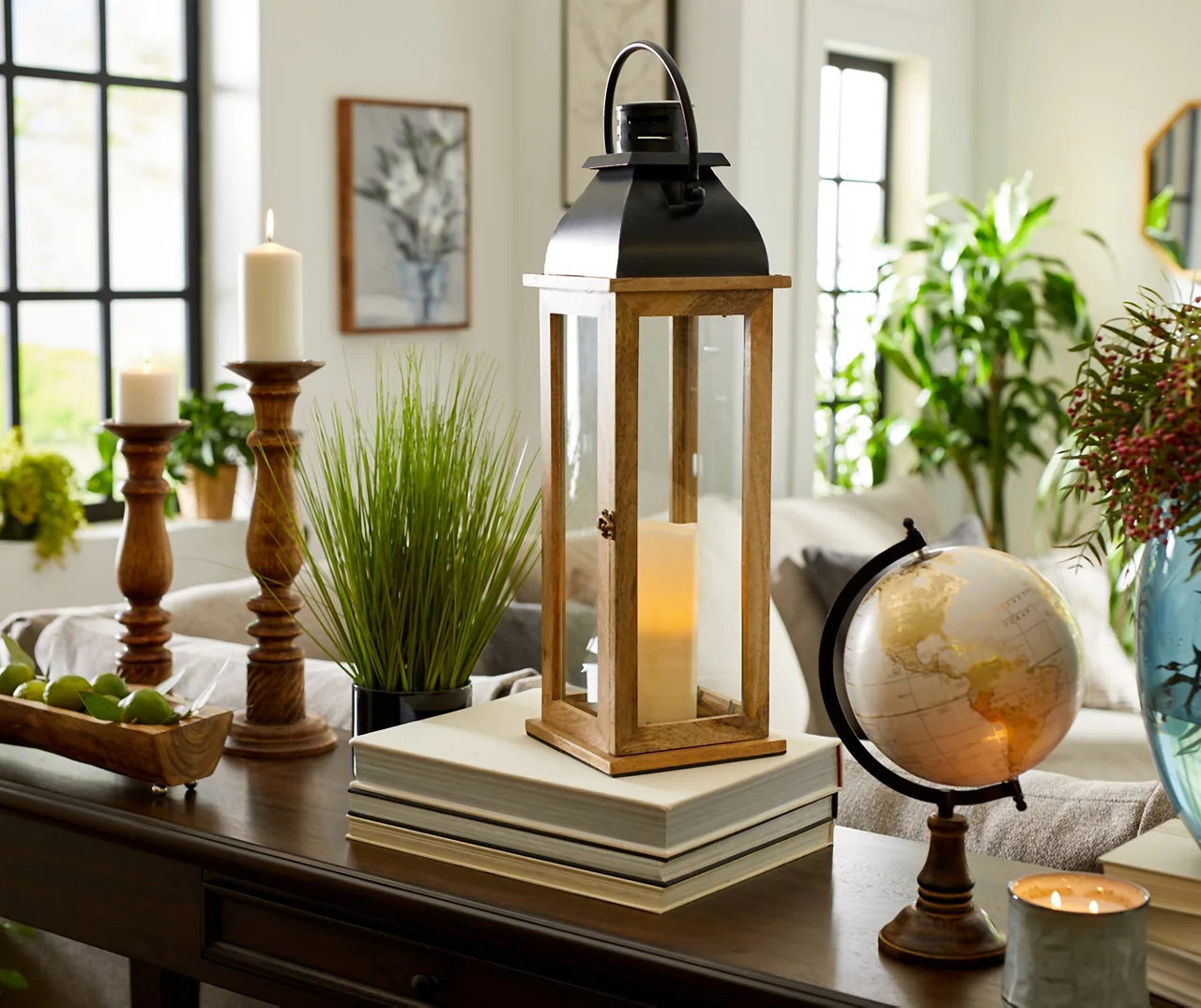 Artificial Greenery With Brown Square Wood Pot & Glass Hurricane