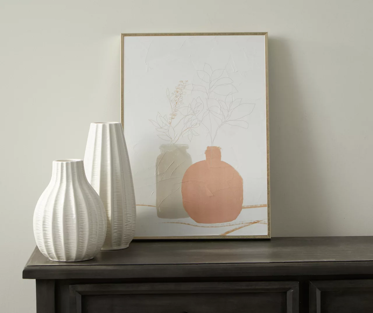 Decorate your home with this beautiful framed wall canvas from Broyhill. Featuring a pretty design of pink and gray potted plants, this canvas hangs from a sawtooth hook on its back, bringing a degree of charm and style to any wall that it graces. The perfect way to spruce up the look of any room in your home.